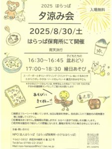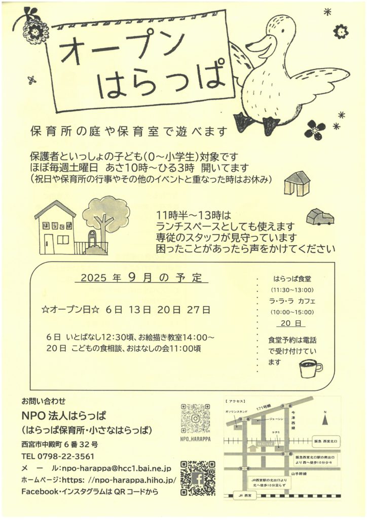 2025年8月31日 / 最終更新日時 : 2025年8月31日 npo-harappa 2025年9月のオープンはらっぱ実施予定 2025年9月のオープンはらっぱは6、13、20、27日に開催を予定しています。⇒詳しくはこちら FacebookXBlueskyCopy コメントを残す コメントをキャンセルメールアドレスが公開されることはありません。 ※ が付いている欄は必須項目ですコメント ※ 名前 ※ メール ※ サイト