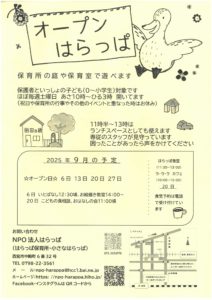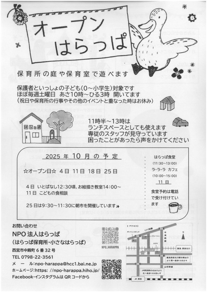 2025年10月1日 / 最終更新日時 : 2025年10月1日 npo-harappa 2025年10月のオープンはらっぱ実施予定 2025年10月のオープンはらっぱは4、11、18、25日に開催を予定しています。⇒詳しくはこちら FacebookXBlueskyCopy コメントを残す コメントをキャンセルメールアドレスが公開されることはありません。 ※ が付いている欄は必須項目ですコメント ※ 名前 ※ メール ※ サイト