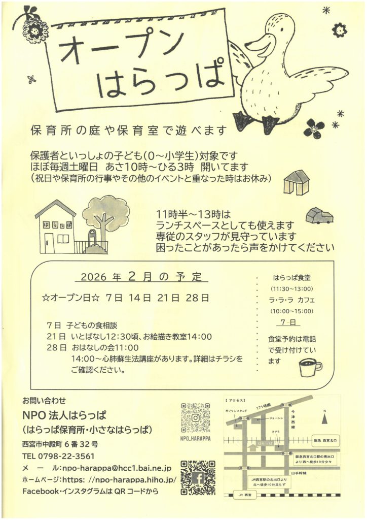 2026年2月2日 / 最終更新日時 : 2026年2月10日 npo-harappa 2026年2月のオープンはらっぱ実施予定 2026年2月のオープンはらっぱは、7、14、21、28日に開催予定です。⇒詳しくはこちら FacebookXBlueskyCopy コメントを残す コメントをキャンセルメールアドレスが公開されることはありません。 ※ が付いている欄は必須項目ですコメント ※ 名前 ※ メール ※ サイト